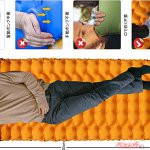 使用方法はいたって簡単で本体を広げてから、2か所から空気を入れるだけなのだ。一般にエアマットといえば本体とエアポンプを接続するタイプが多いが、こちらはポンプが内蔵されており、足で踏むだけという超シンプルな構造となっている。ご覧の通り本体には枕もついているため、これだけで車中泊ができてしまうのだ。