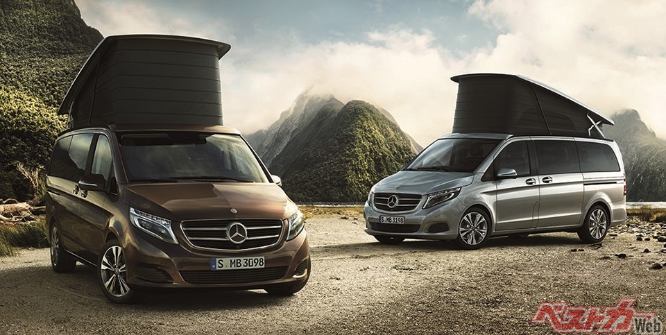 現在、日本で購入できるメーカー製造モデルがメルセデス・ベンツV220dマルコポーロホライゾンだ。商用モデルのV220dに後ろヒンジ前片開きのポップアップルーフを備えたモデルで、ヒンジ部分も少し上方に持ち上がり、拡張時の広々スペースが特徴だ。