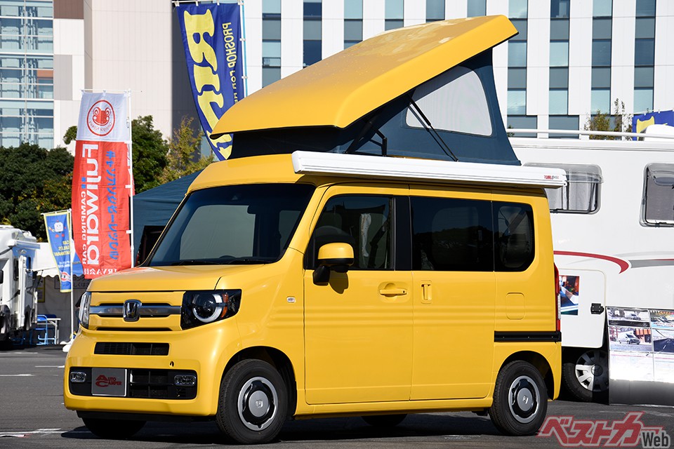 一台目はホワイトハウス・N-VAN POPhotパッケージ。N-VANをベース車にしておりポップアップルーフを装備。プライバシーテント、エアヒーター、サイクルキャリアなども装備可能で、アウトドアをより充実したものにできる一台だ。価格は223万4100円からだ。