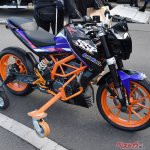 盲目ライダーのライディングにはアウトリガー(補助輪)を装着したサイドアシスト車を使用。補助輪により転倒を防ぐことができるだけでなく、リモコンでエンジンを停止する装置も搭載されているので、コースを外れそうになった際はスタッフが車両を止めることが可能だ。