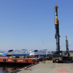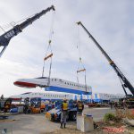 着岸後は巨大クレーンで車体を吊り上げ、トレーラーへ。「N700S」かもめがついに初めて長崎の地を踏んだ瞬間だ。当日は川棚港で歓迎セレモニーが行われ、長崎に「新幹線が走る」ということへの期待感から多くの人が真っ白な新幹線を出迎えた。