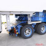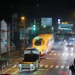 しかし、車両搬送はここから最後の山場を迎える。港から先は大型トレーラーによる陸送にて、大村の車両基地を目指す。陸送は周囲の交通量が減少する深夜に実施されるが、それでも巨大な新幹線車両が片側1車線、しかも湾沿いに走るカーブの多い国道205号を走るという非常にシビアな条件だ。車両後部に取り付けられたタイヤ付きの台車は、単体でも舵切りなどのコントロールが行えるようになっており、カーブでの旋回性を保っている。