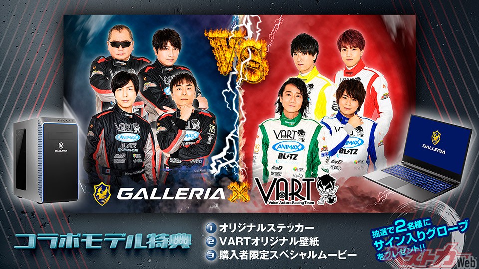 ※アイキャッチ写真…GALLERIA(ガレリア)からVARTとコラボしたゲーミングPCの全5機種が発売された。コラボモデル限定のオリジナル壁紙3種を初期設定及びインストール済。また、購入者限定特典として、VART x GALLERIAオリジナルデザインのステッカー、車両やサーキットなどの臨場感あふれる環境、ダイナミックなライティング、リアルな質感を高次元で再現する 『PC(DMM GAME PLAYER)版 アセットコルサ アルティメットエディション 日本語版』のダウンロード版インストールコードが付属される。さらに初回300台にはVARTファン垂涎の映像特典DVDが同梱する大盤振る舞い!
