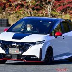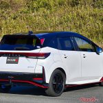 検索サイト『グーグル』で日産と入力すると予測でトップに出てくる注目のオーラのNISMOバージョン。コーナリング性能が抜群だった。外から見るとロール量は多くタイヤに負担がかかっているようだけど、ドライバーに伝わるフィーリングは破綻することなくスムーズに曲がる印象。
