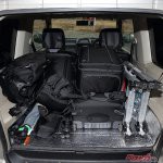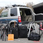 車内は後部座席を倒して機材満載。あらゆる撮影に備えてカメラや三脚、脚立、ライト、雨具、さらには折り畳み椅子、温泉へ立ち寄るためのタオルを積んでいる。そのほか、スコップやポータブル電源も積んでいる。
