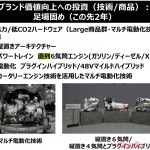 そのための足場固めとして、ラージ群商品には「エンジン縦置きアーキテクチャーの開発」「直列6気筒エンジン(ガソリン/ディーゼル/X)とAWD」「プラグインハイブリッドと48Vマイルドハイブリッドによる電動化」、スモール群商品には「ロータリーエンジン技術を活用したマルチ電動化」、という4つの軸を進めている最中。