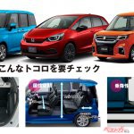 ボディサイズや排気量に制限があるので、小型・中型以上のペットを乗せるという利用には不向きだが、ホンダ N-BOX、スズキ スペーシア、ダイハツ タント、三菱 eKスペースといった、スライドドアを備えたスーパーハイトワゴンならペットを乗せるための条件はクリアできる。いずれの車種もスライドドア部分のフロアの地上高は360~390mmと低く設定されており、後席の足もとがフラットなのでスムーズに乗り込むことができる。