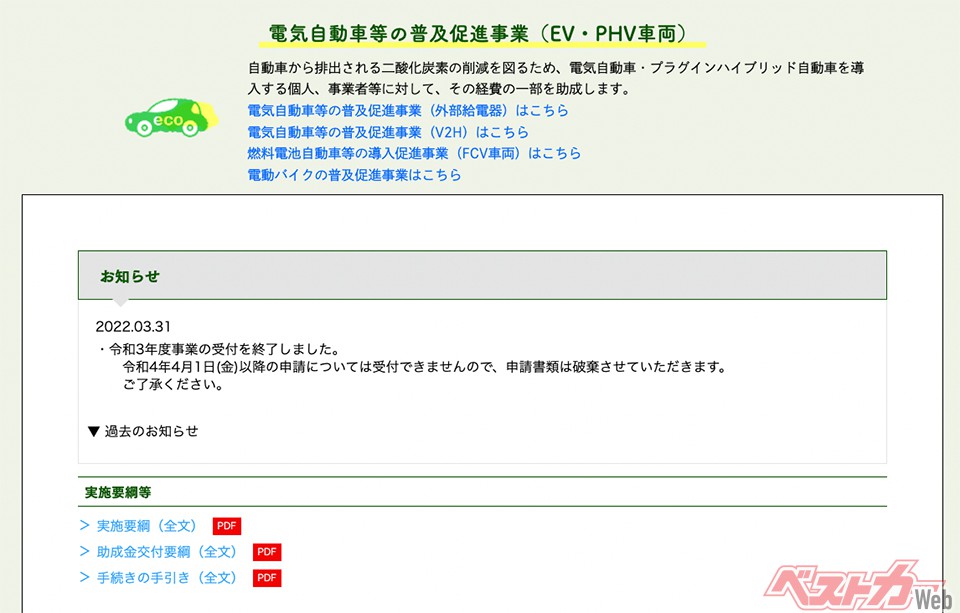 たとえば東京都の場合、4月3日の時点で、補助金業務を担当する「東京都地球温暖化防止活動推進センター」のホームページには「令和3年度のEV・PHV車両への助成事業の受付を終了した」旨が書かれているので、「4月から補助金もらえなくなるのか?」と思うかもしれない。