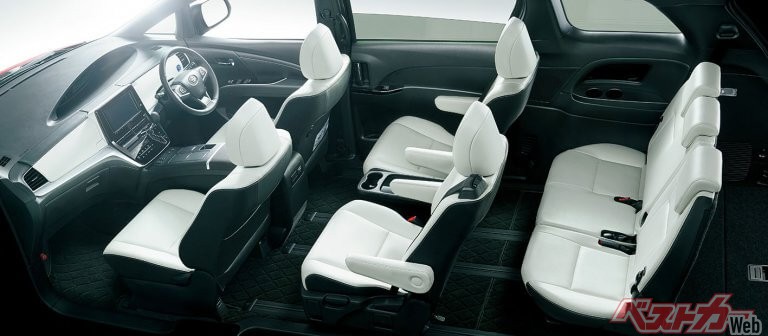 基本的にFWD用プラットフォームを共有しつつも、前ヒンジ式後部ドアを備える身内のライバルするウィッシュ(ミニバンとしてのライバルは、“ほぼ同スペック”のホンダストリームだった)に対して、中型ミニバンとしてボディの助手席(左)側のセンターピラーレス・ボディを実現したことが大きな特徴といえ、開口部幅は1890mmに達していた。