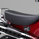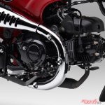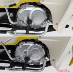 また、エンジンがオールニューになっている模様で、新旧で見比べてみるとケースカバーが全く異なるものになっている。このエンジンは、先に紹介したダックス125と基本は共通で、タイの新型スーパーカブ110がベースのもの。ロングストローク設計とすることで圧縮比が高められており、最大トルクが従来型の0.87→約0.9kg-mに向上するという。