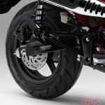 前後足まわりは、グロムと同じ12インチホイールにディスクブレーキを採用。フロントは倒立フォークでリアはモンキー125と同様の2本サスとなる。マフラーはCT125ハンターカブと同じアップタイプでオフロードイメージとしつつ、フロントはダウンフェンダーを採用することから、オフのハンターに対してオンロード主体のクロスオーバーモデルという位置づけになりそうだ。