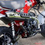 ホイールは前後12インチのキャスト製にオンロードタイヤを装着する。ホイールやタイヤサイズは同系エンジン搭載のスポーツ仕様・グロムと同じで、レースにも対応するハイグリップタイヤに履き替えることも可能だ。一方で、リアサスペンションはオーソドックスな2本ショックとしている。
