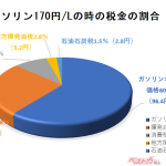 揮発油税と地方揮発油税の合計は定額でガソリン1リッターあたり53.8円。石油石炭税は2.8円/Lだ。合計で56.6円が1リッターのガソリンに含まれることになり、ガソリン価格が1リッター170円とすると、これに17円の消費税が加わる。つまり合計で73.6円が1リッターのガソリンに加わる税金ということ。