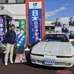 直前に自民党総裁選に出られたこともあって抜群の人気と高い知名度で迎えた2021年9月の衆院選では、全国の他候補応援に忙しく、地元奈良での選挙活動もままならず。その分身として選挙事務所前に飾られて大いに話題となったのが、白いA70スープラだった。