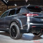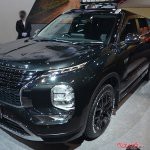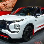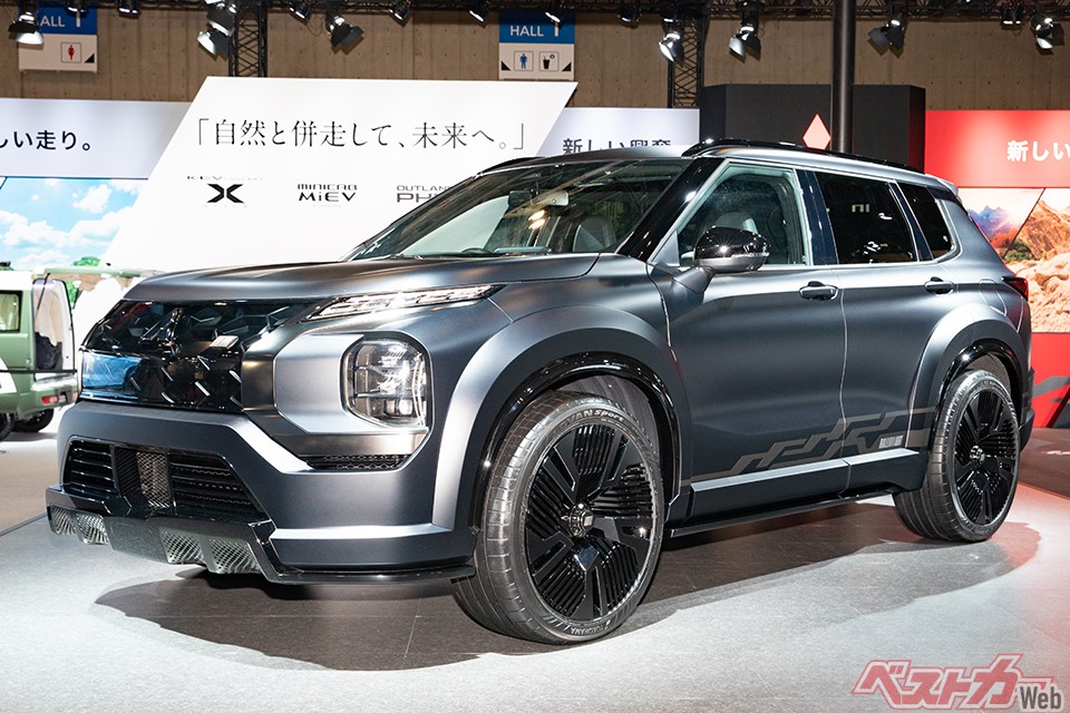 新型アウトランダーPHEVがベースで、そのスタイルは22インチの大径タイヤを収める大きく張り出したオーバーフェンダーをはじめとしたエアロパーツが大迫力。