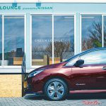 さらに「やすらぐほど充電できる椅子」と名付けられたラウンジ内の椅子は、座ると電気が供給され、スマートフォンへの充電も可能。その充電用の電気は日産『リーフ』から給電する仕組みに……。