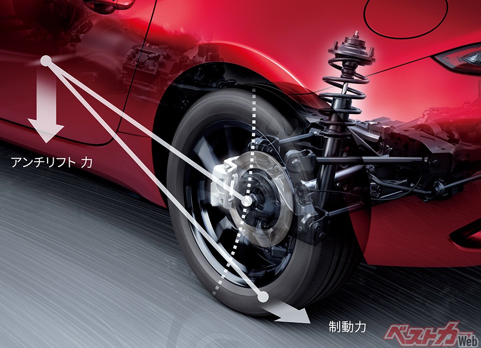 ロードスターのリアサスペンションはマルチリンク式で、もともとアンチリフトのジオメトリーが採用されているので、ブレーキを掛けることによってこのような効果が得られるのだ。
