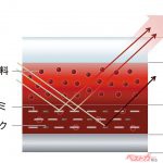 一般的にクルマには、素地となる金属面の上に、1.防錆効果のある下塗り、2.発色を良くし、耐衝撃性を持つ中塗り、3.色みを付ける上塗り(ベースコート)、4.光沢感や艶を与え、外部の環境から塗装を保護するクリア層という順で塗装が施されている。