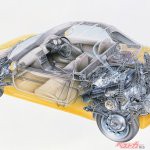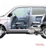 また、ローラー状の電極で連続的に溶接するシーム溶接を 、軽乗用車として初めてドア開口部に採用し、高剛性化に貢献。そしてフロアクロスメンバーなど、フロアまわりの骨格接合に高粘度接着剤を用い、接合面積を広くすることで高い剛性を獲得している。