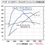 ガソリンエンジンでは、過給すると低速域でノッキングが発生するため、十分な低速トルクは得られません。過給の効果が出るのは主に中高速域です。対してディーゼルエンジンは、ノッキングが発生しないので、過給の効果で低中速トルクが大幅に向上できます。一方で、頑丈な構造のディーゼルは、高速域ではフリクションが大きくなるため、高回転化は難しく高出力は得られません。