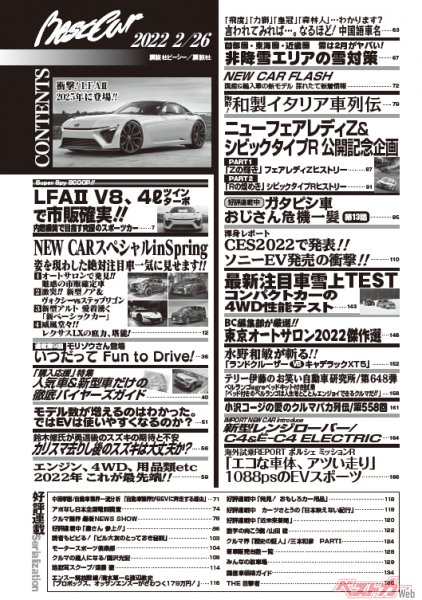 今号のベストカーはいつにも増して内容てんこ盛りです!! LFAIIのスクープに始まり、東京オートサロン2022で登場した市販確定車の詳細レポート、絶対王者ノア/ヴォクシーのわかりやすいニューカーガイドなどなどビックリするほどの充実ぶりです。