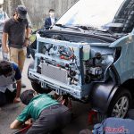 筆者もこの「分解大会」に参加させてもらったのだが、当日はトランジスタ製造会社や、大手モーター製造会社、変速機製造会社、自動車用電装部品製造会社など、多種多様な国内の自動車関連企業の社員なども参加しており、さすがは話題のEVといったところだ。分解は自前の工具を用意してきた参加者たちによってスムーズに進められ、オンボードチャージャー、DC-DCコンバータ、12Vバッテリー、車両接近警報装置、エアコン用コンプレッサなどの各種電装品が車体から続々と取り外されていった。