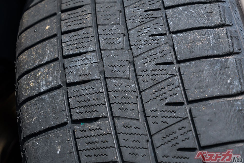 使っていないと劣化による硬化が始まり、やがてタイヤの溝やサイドウォールに細かいヒビが入るようになってしまう。こうなるとスタッドレスとしての性能は大幅にダウンしてしまうことになる。