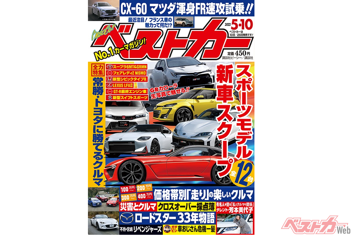 ベストカー5月10日号は「ニッポンのスポーツカーだけの渾身スクープ」特集が目玉。11ページの特集です。GRカローラの最新情報はもちろん新型フェアレディZ NISMOなども取り上げます。さらに、「価格帯別走りの楽しいクルマ」特集も見逃せません。200万円台ではあのクルマ、推しです!